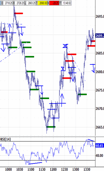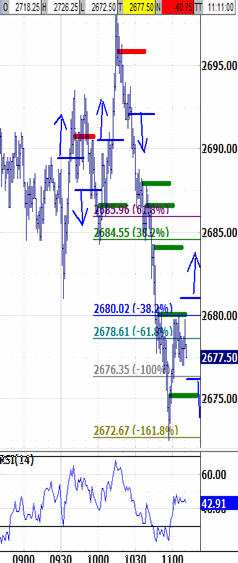 The noon hour bounced 24 points up to 2687.25. Which was actually the second and maximum target of a corrective bounce. Its reaction down to 2671.25 suggested the correction was done,