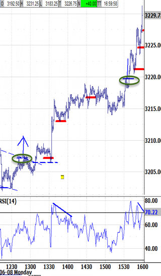 open's uptrend through 9:45 signaled would extend higher through the morning. The bias environment exit had just attacked to within 2 ticks the bear market rally's next minimum target at 3210.50. Afternoon hovering completed a bullish gap-and-go setup, and easily held a bullish Friday trend high close at 3189.50. The high's overbought RSIs were left outstanding.
