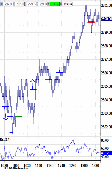 The 2584.50 open had blipped-up 5 ticks and then reversed down into and out of 9:45. Extending down to 2581.50 reacted back up to the opening highs. The 2582.75 bias-down signal held its test to trigger no-bias.