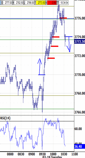 Then, meet in the chaRTroom here by 9:15 ET for updates and Q&A Holding the bias-down signal's test through 10:15 would put into play an offsetting test of the 2777.25 bias-up signal. But the post-open bounce was much stronger than its pre-open predecessor, and tested the bias-up signal in time to invoke the grace period. Now having held a test of the bias-up signal, a test of the 2767.75 bias-down signal is back in-play. It's not required to be tested since it was tested already post-open. But it's usually tested anyway. Perhaps that's because the setup I just described was triggered by the 1 tick. The 2777.25 bias-up signal was attacked to within only 1 tick at 10:30. Actually touching it would have triggered noN-bias, which is more how the morning developed -- shallow 5-6 point backing-and-filling that waited for the window to lapse.Expert Pre-Open Trading Strategy - 7:17 AM
