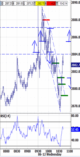 Attacking this morning's 2890.00 bias-up signal and triggering the 2884.00 bias-down signal had put into play the 2876.50 bias-down target. It hadn't been met when the bias environment began lapsing at 11:30, but it was tested by noon. And retested just after noon, too.