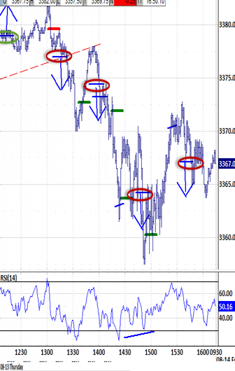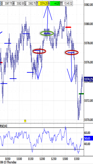 At 10:15 the A.M. BIAS is BIAS-UP: above 3377.00 signal would target 3388.75. BIAS-DOWN: under 3360.25 signal would target 3351.25. NO-BIAS: between both signals. FRI morning signal (triggered at 10:15 ET) SPX ES Bias-up: above 3382.50 3377.00 ...would target 3394.25 3388.75 Bias-down: under 3365.75 3360.25 ...would target 3357.00 3351.50 Signal status: NO-BIAS, TESTED BIAS-DOWN SIGNAL . BIAS VIDEOS... INTRO // EXAMPLE 1. At 10:15, trading above the bias-up signal or under the bias-down signal would put into play a test of its bias-up or bias-down target. 2. Not triggering either bias signal at 10:15 would be "no-bias," and the bias signals should define the bias environment's range. -- A test of the opposite bias signal would be targeted if one bias signal was tested before triggering no-bias. 3. Touching the bias signal within 3 minutes either way of 10:15 would invoke a grace period through 10:30 to trigger a late signal. -- "Late" signals don't require testing the opposite bias signal, but it's still likely. 4. Still testing the bias signal at 10:30 after invoking the grace period would trigger "noN-bias," with no bias influence.