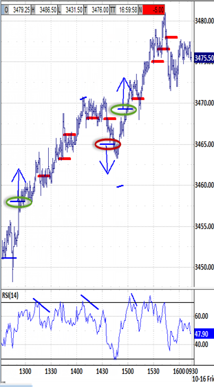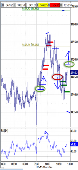 The open's blip-down to 3431.50 reacted up sharply to trend up through the first 15 minutes of volatility. This reflects counter-trend sponsorship reversing the trend. And they were rewarded by extending up to 3457.50.