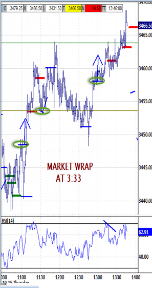 test. Its next lower objective at 3482.00 was met by noon, and the remaining timing windows all ranged choppily around it. Three tests of 3472.50 each reacted up higher and higher to ultimately attack 3494.00, and still dipped to 3477.00 through the close.