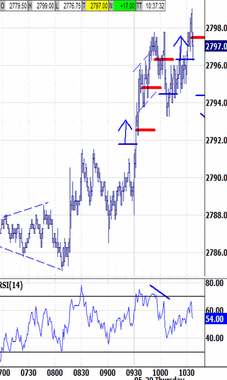 A blip-up to 2799.00 reacted back down to 2795.25, testing its pullback limit. Be careful of the prior four sessions' pattern resuming its post-open selling.