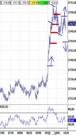 So, we were prepared to take early action on surging through the 2737.00 open through its calculable 2738.75 buy signal. Yesterday's highs were quickly recovered, on the way to filling the gap back up to Friday's 2751.25 open.