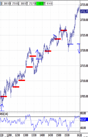 The fresh high promised by the second signal also triggered the afternoon's 2712.50 bias-up targeting 2725.00. It was probed by nearly 4 points before testing a sell signal down to 2719.50. But fidgety shorts overwhelmed the position-squaring window which surged 10 points into the cash session close and added 3 more into the futures close.