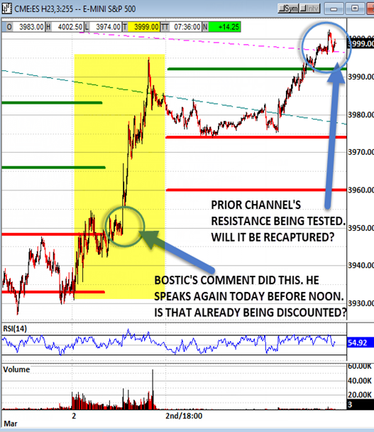 Premise : A lot going on here, be sure to watch the PLANNER video... Further discounting yesterday's P.M. headline is creating a challenge to the month-old channel's nearby resistance, which has failed all previous tests that had also originated from a fresh pullback low. The headline's persistent influence may also be a function of its catalyst -- Fed speaker Bostic -- being scheduled to speak again at 11:45 ET. Already discounting the same comments could find no further upside reaction available, let alone the downside reaction if Bostic decides to tweak or walk-back yesterday's comments. And once again failing to close above a prior relevant resistance, especially having probed it intraday, could accelerate the ongoing decline. Even before then is the PMI/ISM one-two punch of post-open econ reports yet to offer actual data, which Bostic and today's other Fed speakers will address.