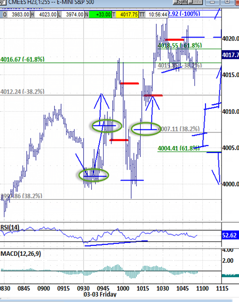 New price points : Extending higher pre-open to the 4010 bias-up target reacted down post-open to a buy setup at 4001 per the 9:15 update. Post-open econs triggered two big swings between 4000-4017 that have resolved up to 4023.
