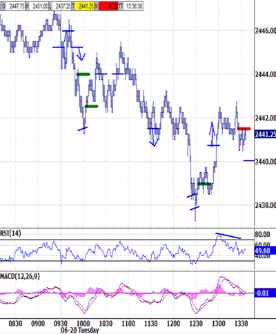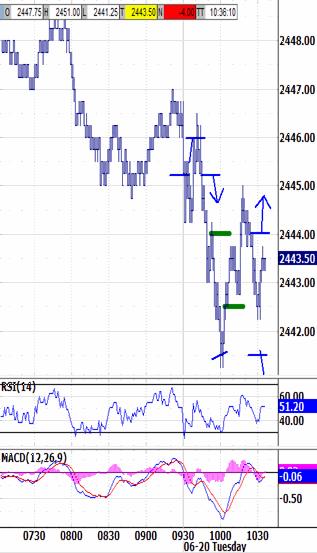 Pre-open dip slides into support. The 2446.25 open resolved down quickly to resume the pre-open slide. A bounce from 2 points lower was anticipated to resolve down, too. Which it did, testing its 2441.50 objective as the Market Tour recording describes. Dipping to 2441.50 also satisfied the Running Correction's retest which had developed during yesterday's open. It's lower quadrant was the likely pullback objective for any downleg that might have developed yesterday. None did.