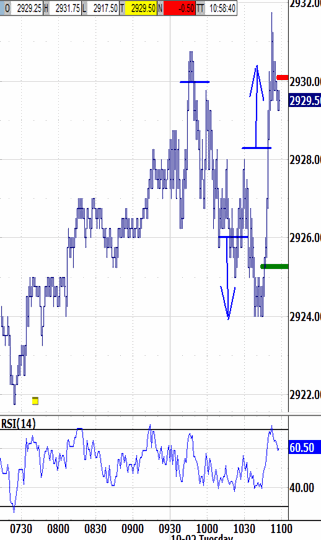The 2925.25 bias-down signal avoided triggering at 10:15. It also avoided being touched by then, so  no offsetting test of its bias-up signal is required. However, probing under it after 10:30 is "no-bias trending" that requires being retraced.