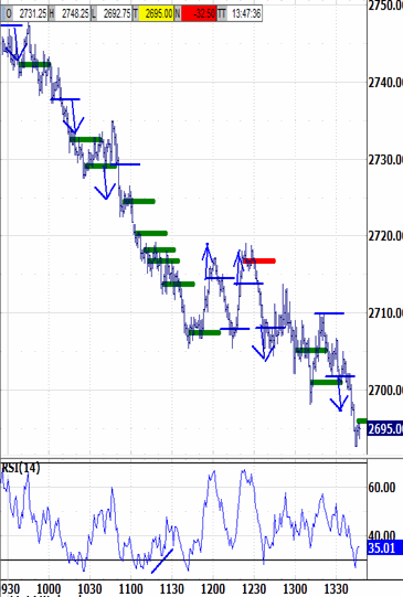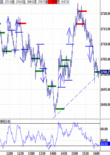 2705.00 had been attacked when the morning bias environment started lapsing. A choppy noon hour has resolved down, and the afternoon bias environment's entry had already attacked its 2698.00 bias-down target. Nevertheless, its 2706.25 bias-down signal wasn't cleanly triggered, so this is a noN-bias environment.