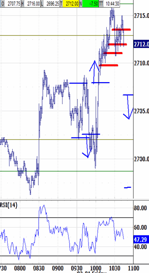 Then, meet in the chaRTroom here by 9:15 ET for updates and Q&A The open hinted at some new volatility, separate from the pre-open Employment Situation reaction. A 10-point pullback through the open down to 2699.00 reacted up to eventually trigger late bias-up. Probing fresh highs up to 2716.00 between 10:15-10:30 adds reliability to a late signal. But price action since then has developed mostly back under yesterday's 2709.00 high.Day Trading Pre-Open Plan - 6:41 AM