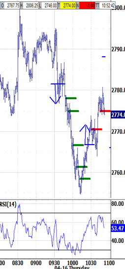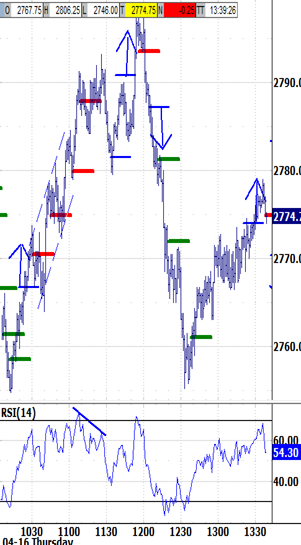 Range bound and down... AND a favor. An offsetting test of this morning's 2788.00 bias-up signal was put into play by holding a test of the 2761.50 bias-down signal. It was tested already and the no-bias signal was late, but its test was still likely. And it was met, probed ultimately by 10 points. But yesterday's range was still likely to contain price action. And the noon hour reversed down to attack 2755.00 at this morning's low. Three very enriching and satisfying trends (including the open's drop from holding yesterday's 2793.00 high), all before this afternoon's bias environment. With tomorrow's expiration only hours away, let alone post-close and pre-open earnings. Beware of the growing potential not only for narrowing the range, but also for price action getting sloppy. A bounce now underway has room above to test the 2783.50 bias-down signal as resistance during this afternoon's bias-down environment. Sloppiness could allow probing above it, but only temporarily. Timing influences become less reliable, too. Back under 2770.50 and 2766.00 would start making fresh lows likely -- and little prevents probing lower. A favor... As you might know, I've been working toward relaunching my service, including an expanded Knowledge Base and also Learning Modules. Currently, my site developer is seeking new "Testimonials & Endorsements." If you don't mind taking a few minutes to share your thoughts, I will very much appreciate it. Anything from how you use the service, to your opinion/description of it, or whatever your thoughts. Thank you!