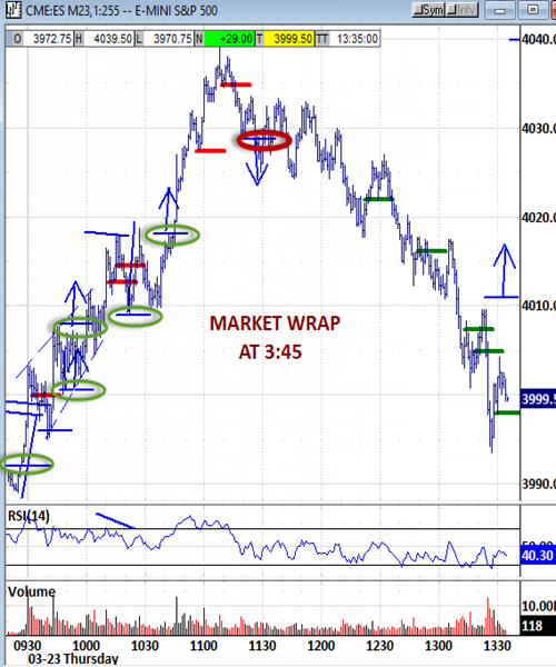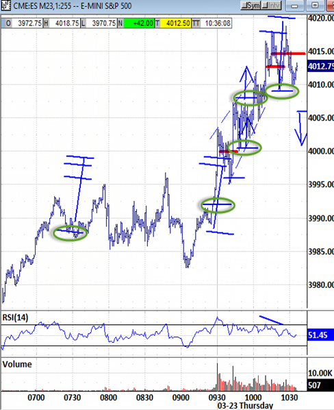 New price points : Targets at 4018 and then 4033 were exceeded to attack 4040 at the A.M. bias window's high. Trending back down through the noon hour to 3994.