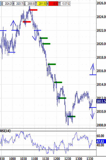 Then, meet in the chaRTroom here by 9:15 ET for updates and Q&A Then the opening range's upper-end broke higher to 2825.50. That probed the 2823.25 bias-up signal. But it was too late to trigger, or to invoke the grace period. Exceeding 2823.25 at 10:30 would have invalidated no-bias, but it wasn't, and it didn't. The reversal targeted 2815.00. It has extended down to 2808.00 at the noon hour's low. Also probably not strong-handed sponsorship, but defensive posturing.Pre-Open Stock Forecast - 7:39 AM