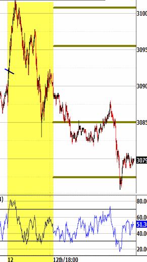 originated too late to be strong-handed. Its retracement extended lower to suggest that Monday's 3077.00 anchor would be retraced, too. And it was tested overnight down to 3076.00. Its support combined with the morning's bias-down target in that area to launch a rally through the morning.