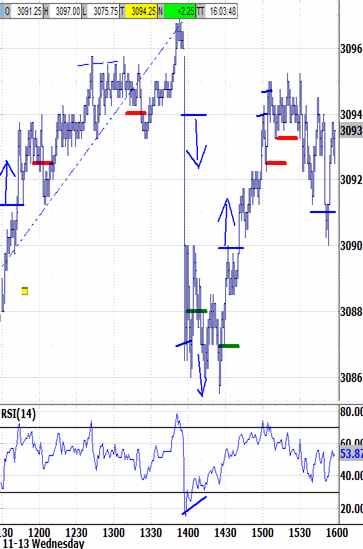 This morning's 3085.00 bias-down signal held its test through 10:15 by bouncing back up to