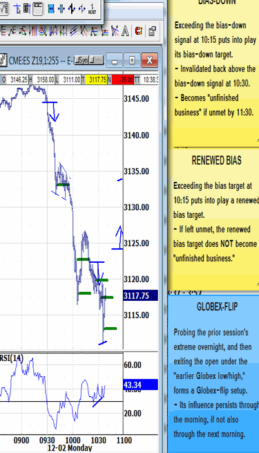Sunday night probed fresh highs up to 3158.00 and reversed to test the 3141.25 "earlier Globex low" before Monday's open. Breaking lower through the open formed a bearish Globex-flip setup that pointed lower through the morning.