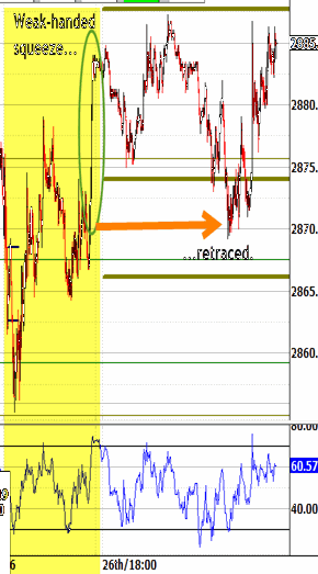 The bullish template would have exited the noon hour back above its 2874.00 entry, to isolate the probe under the noon hour's low. That wouldn't have been necessary if the overnight low would have sufficed for retracing yesterday's late weak-handed squeeze.