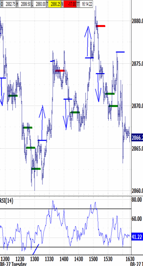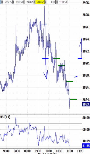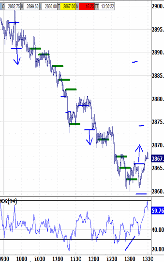 Looking lower for buyers. Reversing the gap up has persisted through the noon hour, after having persisted through the  morning. From blipping-up to 2899.50, the bias environment low tested 2873.00. And now the noon hour was just exited on its low print at 2660.00. The exceeds both bias-down parameters, renewing the bias-down signal. The next lower bias-down target at 2862.50 was within 3 ticks at 1:20, so the bias-down is not doubly-renewed. Instead it is bouncing to try triggering a 2866.00 buy signal.