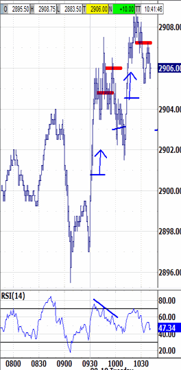 The rally extended into a noon surge that touched 2916.25. Coming within 3 ticks of last Friday's pre-open "new Globex trend extreme" doesn't neutralize its unfinished business,being a structural point and not calculable. The premature hesitation does reflect pessimism, or at least restrained optimism, in either case bullish from a contrarian perspective.