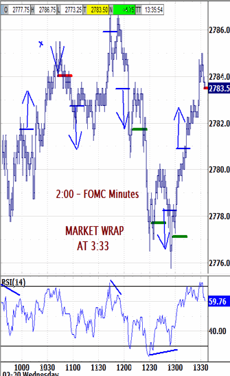 Then, meet in the chaRTroom here by 9:15 ET for updates and Q&A Now the rubber band was stretched, and the market was no longer in the middle of a dull range. The morning's bounce was followed by an 11-point reaction down through the noon hour attacked the 2775.00 bias-down. It was just a warm-up for the FOMC reaction which spiked up to attack 2791.00, and reacted down 17 points to attack the 2773.25 overnight low.Trade Signals - Pre Open - 7:06 AM