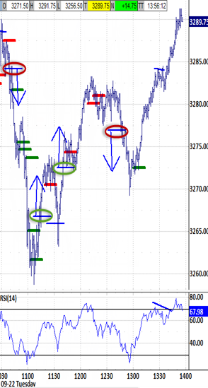 Exiting the open above 3281.00 would be likely to trigger the 3277.75 bias-up signal. Exiting the open under 3274.00 would be unlikely to trigger bias-up. Exiting the open above 3266.00 would be unlikely to trigger the 3260.25 bias-down signal.