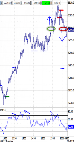 Through the prior close... (summary of last Market Wrap) Trending down sharply Sunday night down to 3247.00 was consolidated into the 3258.00 open. Trending down sharply again past the first hour down to 3218.00 remained under the bearish WedEX's influence through the noon hour. The afternoon bias window's dip back down to 3222.00 only stretched the rubber band to surge through the final hour up to 3276.50. Overnight action's new info... (nearby chart is last intraday session and Globex) Choppy overnight action has essentially ranged sideways. Extending higher from the 3270.50 cash session close before and after the Globex open soon extended up to 3289.00. That was soon retraced back under the earlier Globex low, down to 3256.50 through Europe' opens. A rally from there has recovered yesterday's post-close high up to 3282.50. If, then... (notes to accompany the Tour recording) Yesterday's last hour 57-point rally gained no traction for its sizeable effort, so rallying this morning at least requires gapping up above the 3270.50 cash session close. Regardless, not trending up through the open would be vulnerable to launching another downleg -- maybe just back into yesterday's range, but potentially down to its oversold RSIs at the morning's low requiring retest, probably down to 3208.00. A near-term bottom largely depends on price action staying in motion, whether already reversing down, or probing fresh lows. Otherwise, simply containing this morning's price action within yesterday's range begins validating its level to prevent a later rally effort from rejecting it. First Trade... (9:45 preliminary indications for the 10:15 Bias parameters)