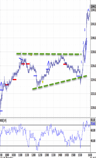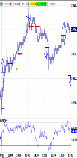 Holding up. The 3229.25 open's recovery extended almost relentlessly to and through the morning's 3235.25 bias-up target on the way to 3238.00. That probed the 3237.00 room for noise by 1 point, but only overlapped it. Overbought 1-minute and 3-minute RSIs are left outstanding at the high. Reversing down to 3233.00 triggered a sell signal, but never attracted reinforcements before 61.8{faed0d6dca04cec8b6b7985efddb9b0651107a3aebb05f69f0166038b8c951f6} of the noon hour elapsed. Still holding well into positive territory AND above prior intraday highs at that point makes the attraction above likelier to be met before a reliable downleg can form. In fact, the reversal down to 3233.00 has reacted up to now attack 3237.00. Overbought RSIs another point higher would pierce this afternoon's 3237.75 bias-up signal, which it's too late to trigger. Neutralizing the attraction above would allow another downleg to form.