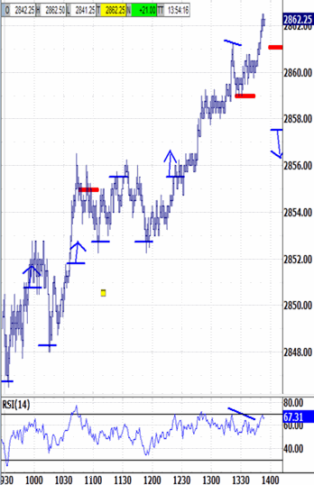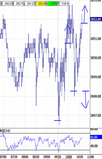 If this sounds like a lot of contradicting indications, that's because it's a lot of contradicting indications. The offsets undermine each other, and make trending in either direction difficult. So does this: Since 3 of the first hour's 5 15-minute checkpoints overlapped the same relevant level (2849.00), this is a "dry cleaners morning" which is unlikely to trend.