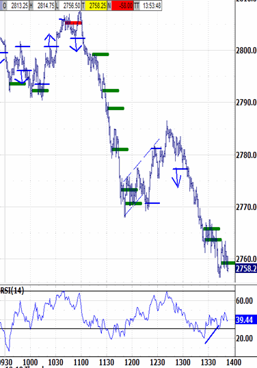 The least influential, since its 2760.75 bias-down target is already met. And it's being probed, which doesn't contradict this being a bias-down environment. Having said that, exiting the bias environment above or below its already-met target would offer extra confirmation to the decline's durability today.