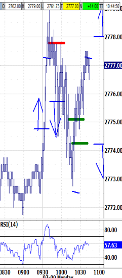 Through the prior close... Thursday night's choppiness had fluctuated between probing the 2739.75 intraday high up to 2747.25 to retracing it down to 2731.25. The setup can be as bullish as it would have been bearish, when fully formed but not triggered. Friday's Employment Situation report triggered a surge to 2744.50, that still needed another dip before the open could rally to fresh highs. The pre-open restraint paid off by letting post-open buying pressure run up to 2764.25 into the noon hour. Potential to the low 2760's was fulfilled, and the balance of the session fluctuated around 2760.00-2761.00. A late dip down to 2757.00 began too late to be strong-handed, and snapped back up to attack 2764.00 into the close. Two-week old gaps and higher prior lows were tested from below, and held through the close to prevent putting any higher targets into play. Overnight action's new info... Sunday night's open was uneventful, no gapping involved. But price immediately began firming back up to and through Friday afternoon's highs. Extending to 2774.50 by midnight has since ranged sideways between 2770.00-2775.00. The upper-end is being pierced now. If, then... Despite not retracing the initial upleg, the overnight plateau disqualifies overnight action from being relentless trending. Nevertheless, the burden of proof is on buyers to maintain a gap coming out of the weekend. Already probing above this morning's bias-up 2772.50 target, the next higher resistance is likely to be tested at 2777.25. Testing 2780.00, too, during a relevant window would make its recovery -- or rejection -- predictive. In other words, testing 2777.25 and/or 2780.00 must be maintained to avoid reversing down sharply through the morning. First Trade... [Click here to view the Bias parameters] Exiting the open at 9:45 under 2764.25 would be unlikely to trigger the 2766.00 bias-up signal at 10:15. Exiting the open above 2768.25 would be likely to trigger bias-up. Exiting the open under 2772.00 after testing 2777.25 could reverse momentum down.