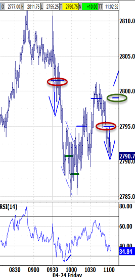 down signal was put into play by holding a test of this morning's 2802.50 bias-up signal. The morning's low attacked 2782.00 before reversing back up through the noon hour. So, 2777.00 becomes "unfinished business."