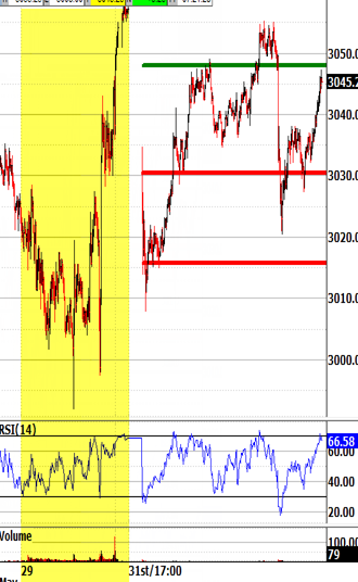 Exiting the open above 3043.00 would be unlikely to trigger the 3030.50 bias-down signal. Exiting the open under 3025.25 would be likely to trigger bias-down. Exiting the open under 3043.00 would be unlikely to trigger the 3048.00 bias-up signal. Exiting the open above 3057.50 would be likely to trigger bias-up.