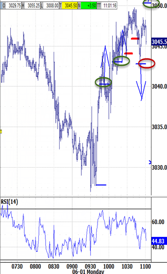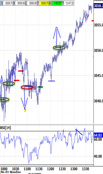REMINDER: I'M AWAY FROM THE SCREENS FOR TODAY'S LAST 60-90 MINUTES (no Market Wrap recording or blog post). The open was greeted by a broad cross-section of individual stocks firming. Weekend riots seemed to renew interest in some of the previous home-quarantine beneficiaries, and probably had some contribution to Retailers weakness. Ironically, this may have been the catalyst behind firmer Autos, Airlines, Cruise lines, and even Space Rockets (SPCE) -- their common theme might be whatever the mode or destination, people are only more motivated to leave their city, country, continent, or planet. Meanwhile, indexes struggled within the overnight range. The open's dip only stopped 1 tick short of even starting to trigger a sell signal. Its reaction held a test of the bias-up signal. That did put into play an offsetting test of its 3030.50 bias-down signal. But the objective wasn't met and now becomes unfinished business that requires an eventual test. Add it to the oversold RSIs at Wednesday's 2965.50 low. The premise for resolving this morning's range up was that it would be rewarded by at least probing above last week's highs. The bias-up signal triggered and is targeting 3060.25. That said, already attacking the bias-up target to within 6 ticks at 3059.00 means it wouldn't become unfinished business if left outstanding. And there's a WH press conference upcoming. But a negative reaction has room down to test this afternoon's 3050.50 bias-up signal, and another 30-45 minutes of the bias-up window before triggering a reversal would be more reliable.
