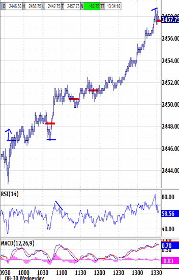 The open only temporarily probed the 2445.25 overnight low by 2-1/2 points. And now the overnight high is being probed up to 2458.75.