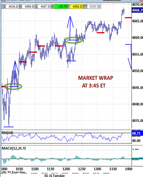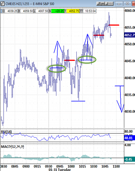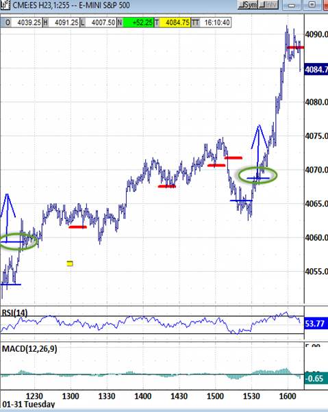 New price points : Higher highs through the noon hour attacked the 4066 bias-up signal. Now it's being probed by at least a couple of points, but too late either to trigger or invalidate it.
