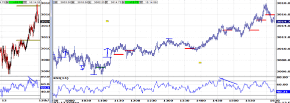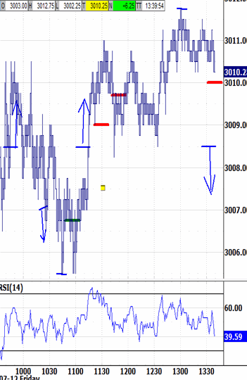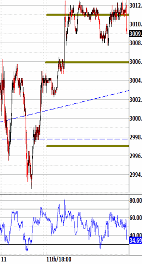 Still range bound. Last night's narrow range failed its modest attempt to break lower this morning, holding 3005.50. Is that today's trending attempt? Fridays often contain at least one. And when that attempt is early, and it fails, the balance of the session tends to retrace in the opposite direction. There's not a lot of room above to simply retrace. In fact, the noon hour's exit at 1311.75 is 3-4 ticks off of the overnight high. And 1311.75 has been the likely upside attraction, so now it's neutralized. If the market does intend to trend more intently, then it would likely probe sharply lower session lows. And its probe would likely begin during this afternoon's no-bias environment, with room to the 3003.75 bias-down signal until the window starts lapsing.