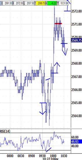 The overnight rally had pierced this morning's 2569.00 bias-up target by 1 tick. Its reaction down through the open touched this morning's 2563.50 bias-up signal.