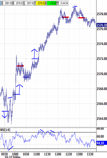 New trend highs up to 2580.75 printed when the afternoon bias environment came within view of lapsing. The actual lapse trended back down under the noon hour's 2578.75 prior high. This setup creates risk of trending down during the final hour.